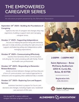 Healthy Aging education series. The empowered Caregiver: this education series teaches caregivers how to navigate the responsibilities of caring for someone living with dementia. Caregivers can register for individual courses to meet their needs or complete the entire series. Please call (208) 206-0041 if you have more questions or to register.
