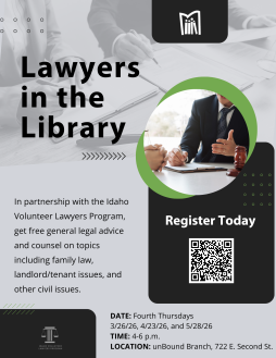 In partnership with Idaho Volunteer Lawyers Program, get free general legal advice and counsel on topics including family law, landlord/tenant issues, and other civil issues.