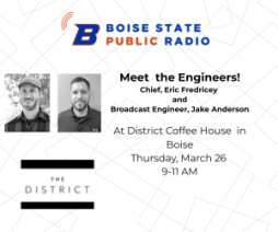Join Boise State Public Radio Chief Engineer Eric Fredricey and Broadcast Engineer Jake Anderson for your morning cup of coffee and an opportunity to talk shop and have all of your questions answered. Ever wondered how we reach some of the most remote areas in Idaho, how signal quality is affected, or projects we're working on? Come down and say hello!