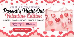 Enjoy a Valentine’s night out while we take care of the fun! Drop your kids off at Sound & Stage for a cozy, creativity-filled evening packed with Valentine’s crafts, playful games, dinner, snacks, and a movie they’ll love.