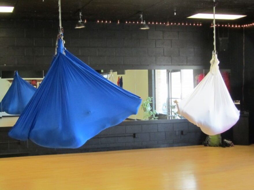 That’s true for Trisha Anderson. This is her second aerial yoga class. She says she’s not very flexible, and the hammock helps her out.