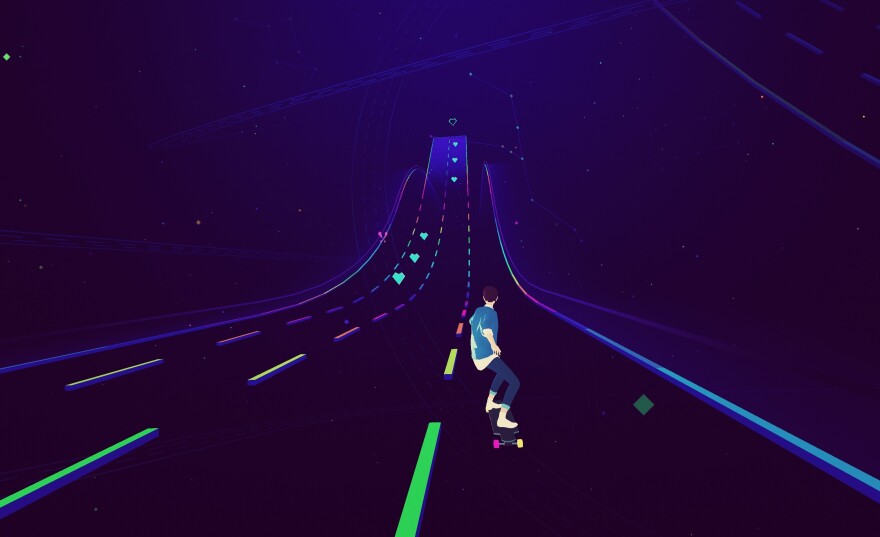 From there, a few familiar paths emerge. At its heart, Sayonara is an "auto-runner" — the player charges toward the horizon of a darkened cityscape, avoiding obstacles and gathering heart-shaped collectibles to rack up points. But surprises abound: In the course of her journey, The Fool will trade her skateboard for a motorcycle, a drifty convertible, a Green Goblin glider and the back of an enchanted deer, each one subtly changing the pace and style of play. At times she'll break format completely to face an enemy in a swordfight or an Atari-style shoot 'em up. And even at their most straightforward, each level is also bound to the rules of rhythm games (think Guitar Hero), where the key to landing a move is lining it up with the music. Luckily, the music is great.